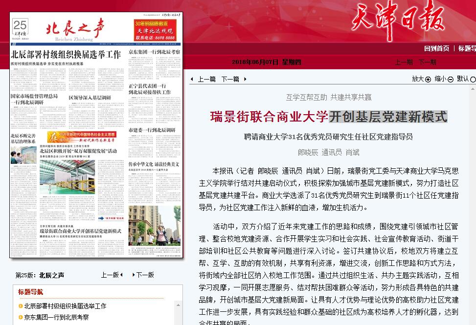 近日,《天津日报》以“瑞景街联合商业大学开创基层党建新模式”为题,对公司党委与瑞景街党工委结对共建活动进行报道。以下是报道全文: