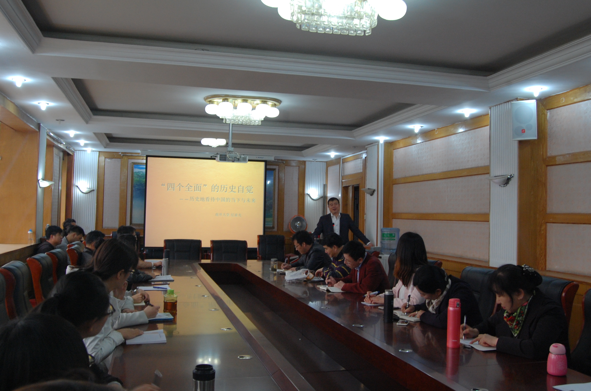 纪亚光教授以“四个全面的历史自觉——历史的看待中国的当下与未来”为题,对“四个全面”战略布局进行详细解读。他指出“四个全面”战略布局标志着我国社会主义建设进入全新时代,“四个全面”战略布局下应具有的历史自觉就是顺应中国现代化的历史潮流,中华民族伟大复兴的关键在于社会的觉醒、民众的觉醒。中国共产党具有不辱使命的良好基础,中国的未来即是观照世界和人类的未来。