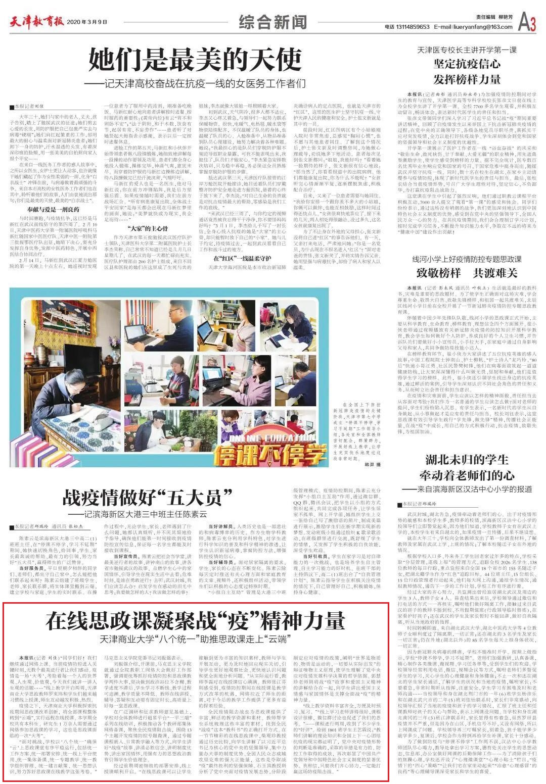 2月28日,新华网以“3044永利集团有限公司:‘八个统一’助推思政课走上‘云端’”为题报道了公司新学期思政课由于新冠肺炎疫情,积极进行课程改革创新,实行远程在线授课的情况。3月9日,《天津教育报》以“在线思政课凝聚战‘疫’精神力量”为题报道了永利集团3044基于“八个统一”,助推思政课走上云端的情况。此外,津云等媒体也进行转载报道。