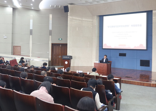 报告会上,袁世军作了题为《学习贯彻习近平文化思想 更好担负起新的文化使命》的报告,指出习近平总书记在新时代文化建设方面的新思想新观点新论断,内涵十分丰富、论述极为深刻,是新时代党领导文化建设实践经验的理论总结。他从全国宣传思想文化工作会议召开时代背景入手,从理论、实践两个维度,系统梳理了习近平文化思想形成的历史脉络,重点讲解了习近平文化思想的“九个坚持”“十四个强调”“七个着力”等内容,为更好地肩负起新的文化使命、加强党的创新理论的宣传研究阐释作了深入解读。