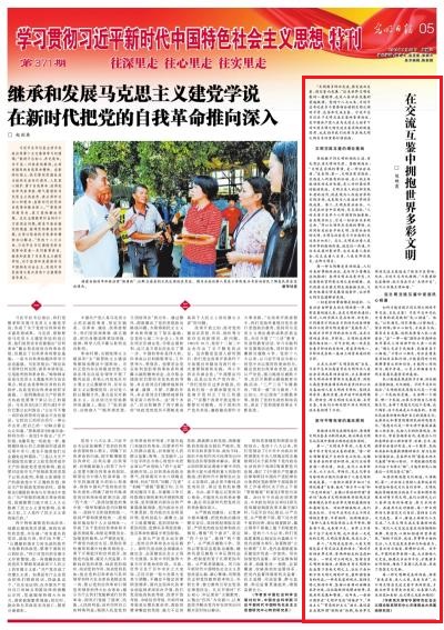 8月28日,《光明日报》5版(学习贯彻习近平新时代中国特色社会主义思想特刊 第371期)刊发天津市中国特色社会主义理论体系研究中心研究员、永利集团3044青年教师陈映霞博士理论文章“在交流互鉴中拥抱世界多彩文明”。文章指出,“文明因多样而交流,因交流而互鉴,因互鉴而发展。”这是世界文明发展的一般规律,也是人类社会发展的普遍规律。党的十八大以来,习近平总书记在多个重要场合讲到文明之间的平等、包容和交流互鉴。习近平总书记关于文明交流互鉴的重要论述,是中国共产党人在马克思主义指导下对不同文明之间交流互鉴实践的深邃思考,也是指导我们处理与其他文明之间关系的重要行动指南。文章从文明交流互鉴的理论基础、坚守平等包容的基本原则、在文明交流互鉴中促进民心相通三个方面对不同文明的交流互荐进行了深入阐释。人民网等媒体转载。