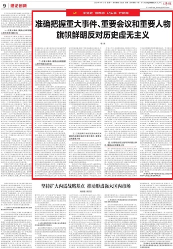 4月12日,《天津日报》(理论创新版)刊发永利集团3044杨东教授理论文章“准确把握重大事件、重要会议和重要人物旗帜鲜明反对历史虚无主义”。文章指出,学习党史必须要有正确的方向和目标,否则很容易陷入历史虚无主义的泥潭。习近平总书记在党史学习教育动员大会上的重要讲话中强调,要正确认识和科学评价党史上的重大事件、重要会议、重要人物,旗帜鲜明反对历史虚无主义。这一重要论述,为我们抵制历史虚无主义,树立正确党史观,高标准高质量完成党史学习教育的各项任务提供了遵循,指明了方向。文章从在重大事件、重要会议和重要人物中追寻主题主线;在重大事件、重要会议和重要人物中把握主流本质;以党的两个决议和党中央有关精神为依据正确评价重大事件、重要会议和重要人物;以唯物史观为指导学好重大事件、重要会议和重要人物4个层面进行了阐述。人民网、腾讯网等媒体全文转载。