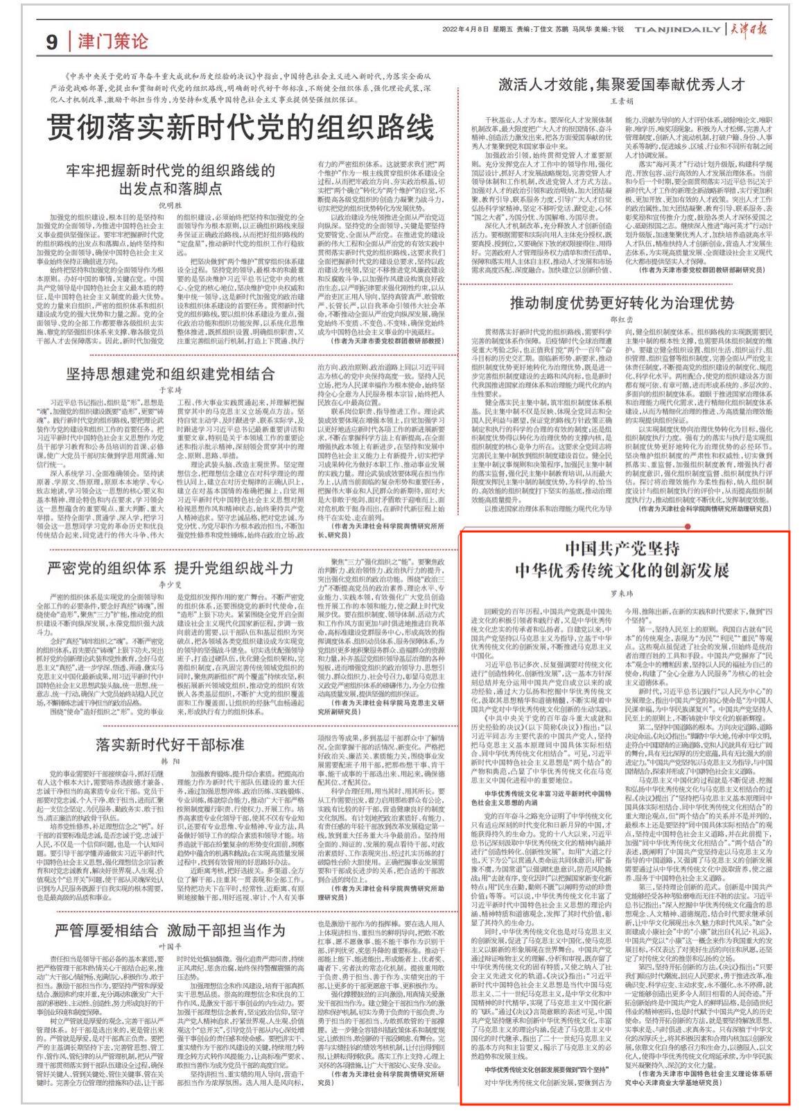 2022年4月8日,《天津日报》刊发公司罗来玮博士理论文章“中国共产党坚持中华优秀传统文化的创新发展”。文章指出,回顾党的百年历程,中国共产党既是中华优秀传统文化积极引领着和践行者,又是中华优秀传统文化忠诚的继承者和弘扬者。自建党以来,中国共产党坚持以马克思主义为指导,立基于中华优秀传统文化的创新发展,不断推进马克思主义中国化。文章从中华优秀传统文化丰富习近平新时代中国特色社会主义思想的内涵、中华优秀传统文化创新发展做到“四个坚持”等两个层面进行了阐述。