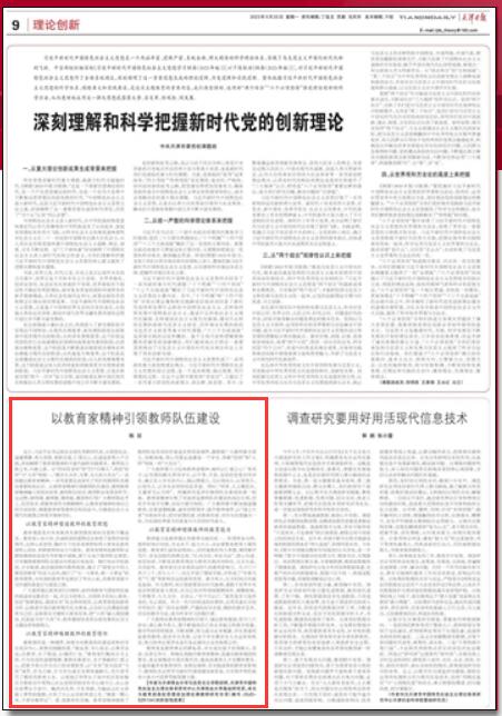 文章指出,教师是立教之本、兴教之源。从“四有好老师”到“四个引路人”,再到“经师”与“人师”相统一,“做员工为学、为事、为人的大先生”,一直到提出教育家精神,一系列重要论述深化了我们对教师队伍建设重要性的认识。以教育家精神引领教师队伍建设,要将教育家精神融入师范生培养、教师职后培训、教师职业发展各环节、全过程,铸师魂、重师德、强师能,激励和引领广大教师取法乎上、见贤思齐,将教育家作为楷模榜样,以教育家精神校准自己的行动坐标,朝着教育家型教师目标而奋斗,为建成社会主义现代化强国之师筑牢精神支柱。文章从以教育家精神塑造教师的教育理想、以教育家精神唤醒教师的教育情怀、以教育家精神增强教师的教育能力三方面进行深入阐述。