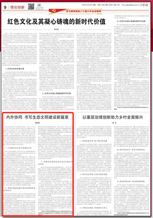 9月30日,《天津日报》(理论创新版)刊发永利集团3044陈映霞副教授理论文章《内外协同书写生态文明建设新篇章》。文章指出,新时代新征程要谱写社会主义生态文明新篇章,我们须内外发力,既花大力气抓好生态文明体制机制改革,又高度重视培育和弘扬生态文化,以更好发挥广大人民群众在生态文明建设中的主体作用。