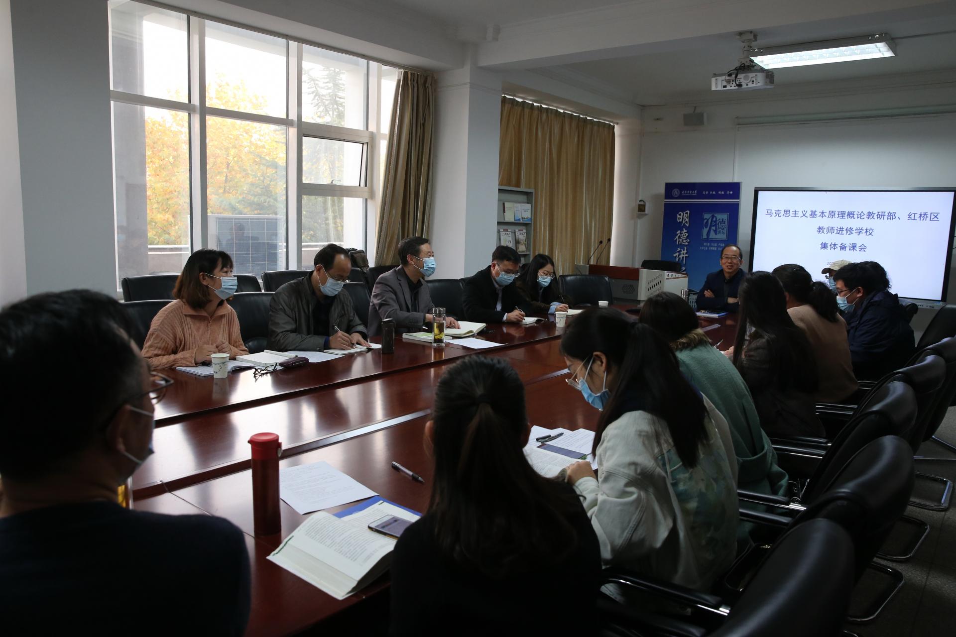 集体备课会贯彻“备理念、备资源、备方法、备问题、备员工”的工作理念,近现代史纲要教研部杨东副教授围绕“中华民族的抗日战争”部分,就抗日战争讲什么、怎么讲进行说课。马克思主义原理概论教研部石玉顶教授围绕“价值量的决定及变化趋势”进行说课,分享在教学过程中的经验与方法。与会教师围绕课程讲授中的重点、难点进行了充分的研讨交流。