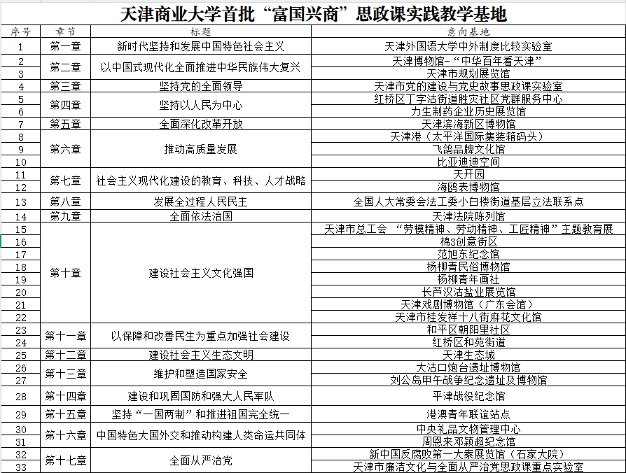 首批建成的33个实践教学基地,类型多样、覆盖面广、资源富集,对应习近平新时代中国特色社会主义思想概论课程的17个专题章节,蕴含着各门思政必修课的教学重点,集中体现了党的十八大以来党和国家发生的历史性成就和发生的历史性变革,昭示着中国共产党的初心使命和性质宗旨,体现着革命文化的红色基因、中华优秀商业文化的时代价值。以基地为依托开展实践教学,打破了思政课各门课程的壁垒,形成课程之间的有机联动、系统整合,构建起了内容丰富、特色鲜明、覆盖面广的思政课实践教学基地体系,尤其是重点建设的7个老字号的实践教学基地,蕴含着鲜明的工商文化、津派文化特征,是开展“老字号里的思政课”的有利场所。